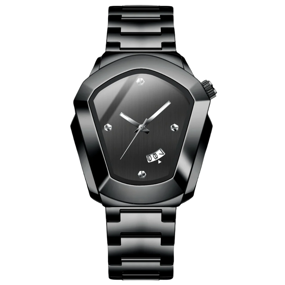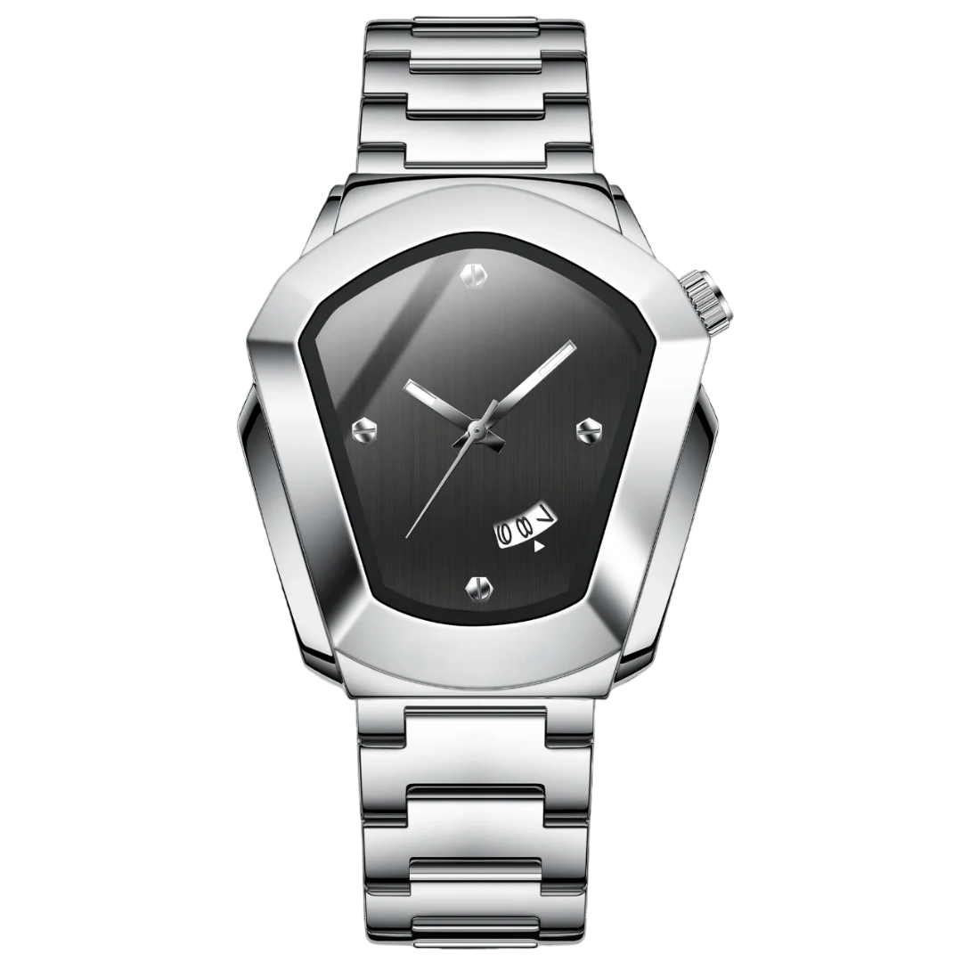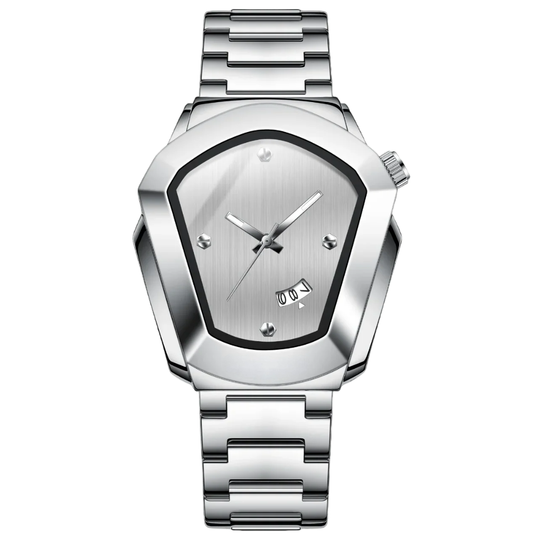 UNIQUE. AUDACIOUS. IRRESISTIBLE. This timepiece dares to challenge the ordinary with a design that instantly catches the eye. Its unconventional silhouette, minimalist dial, and refined detailing create a bold presence on the wrist. The integrated date feature adds a practical touch, perfectly complementing the watch’s striking allure and refined geometry.
