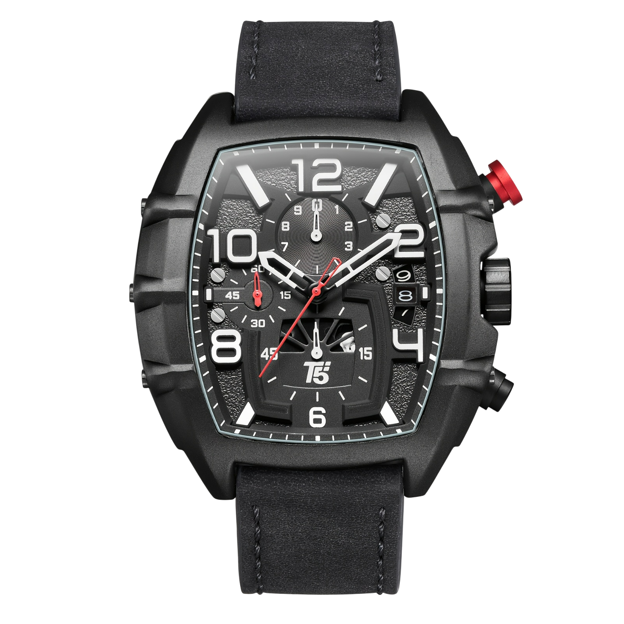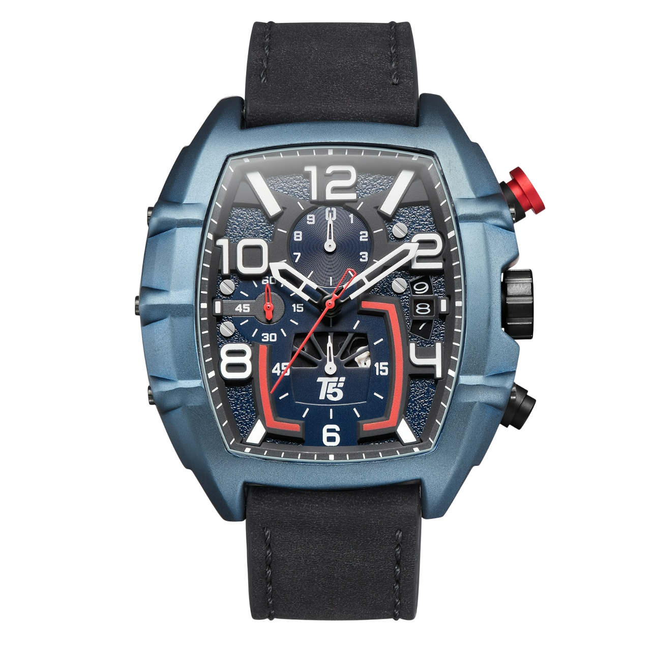 Materials: Stainless steel case & Leather Strap, 5 Bar water resistance