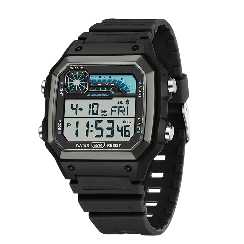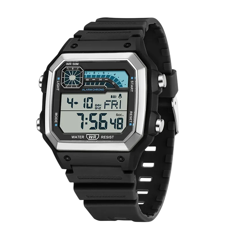 Materials: Polycarbonate case & Silicone strap, 5 Bar water resistance