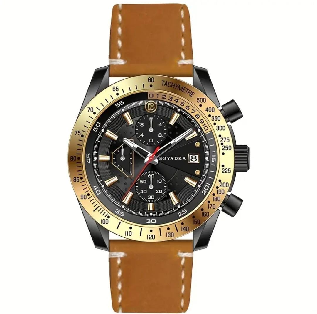 Materials: Stainless steel case & Leather strap, 3 Bar water resistance