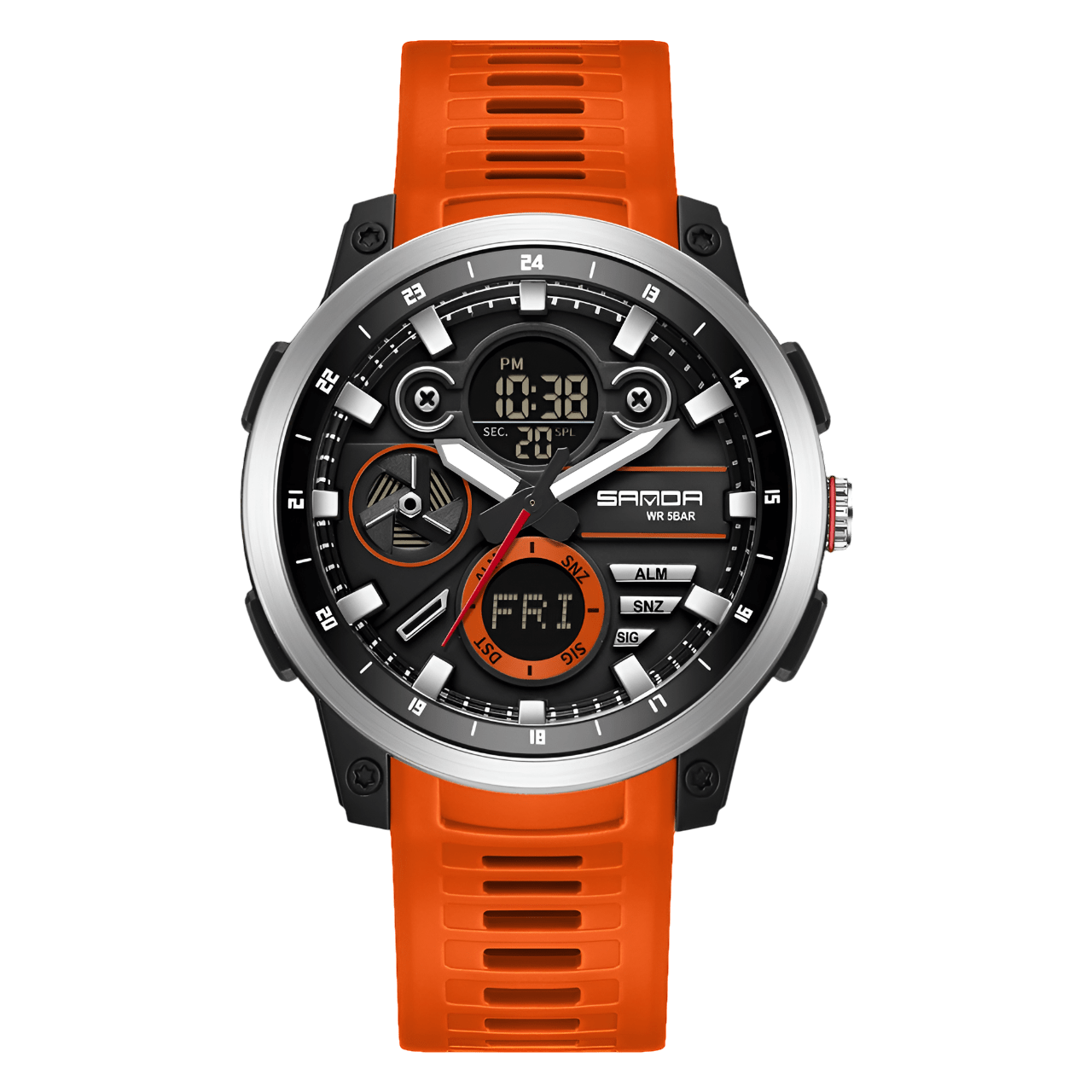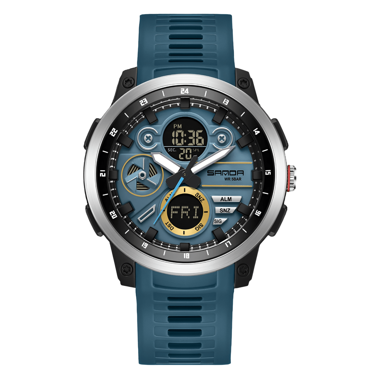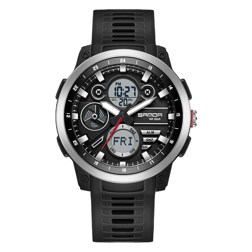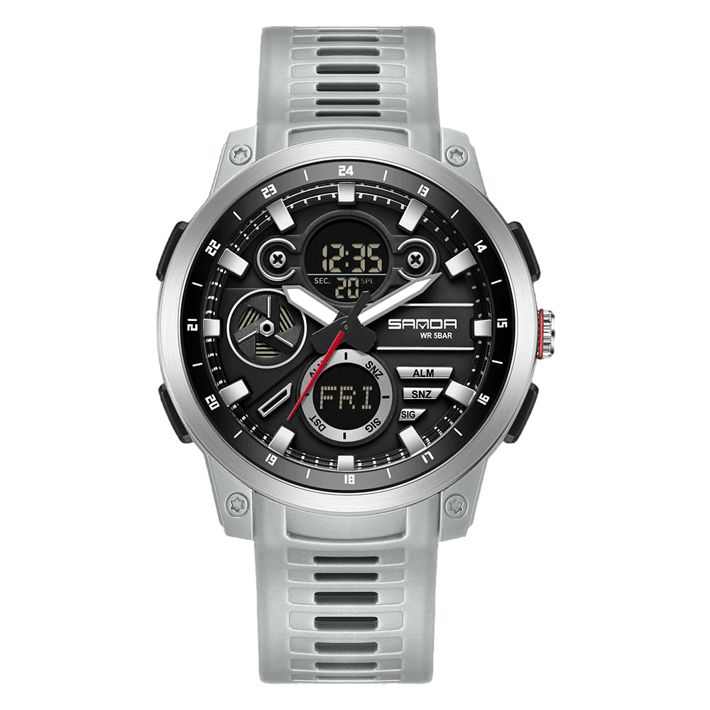 • Materials: Stainless steel case, Silicone strap, 5 Bar water resistance